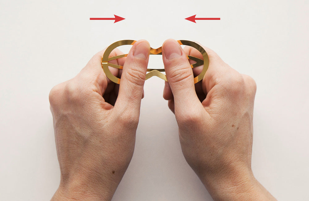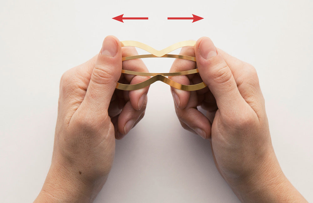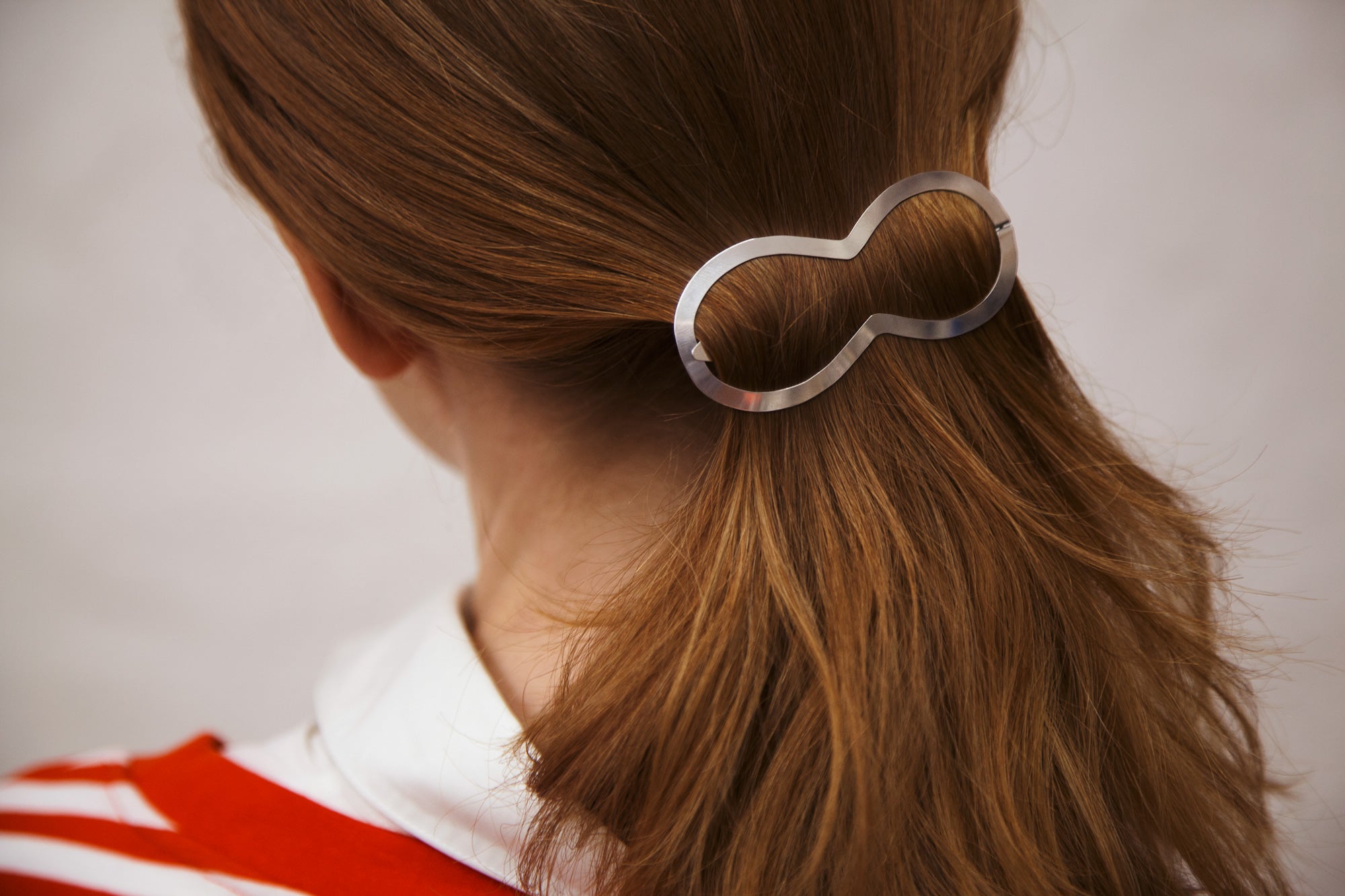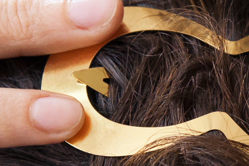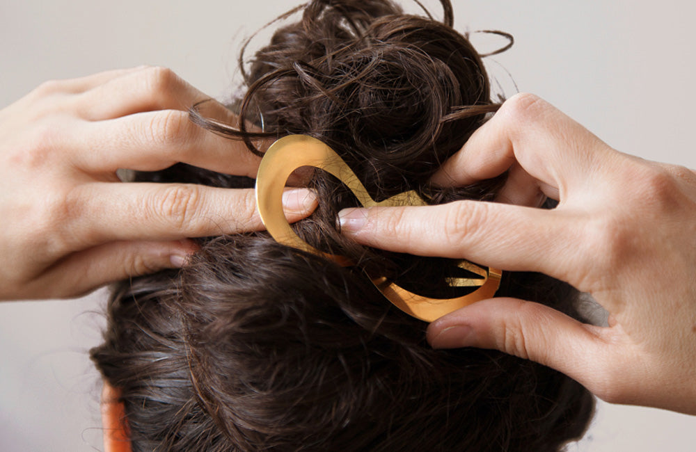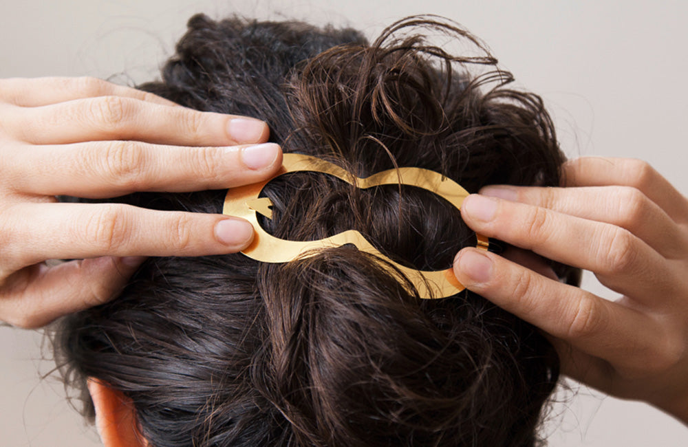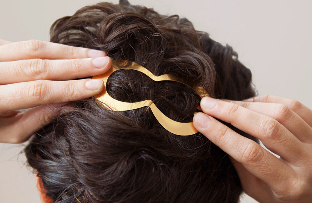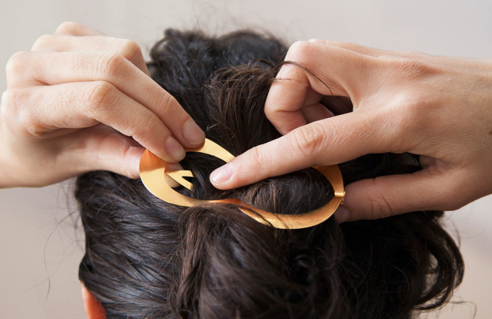 If you have fine hair, or would like to hold larger amounts of hair in a knot or ponytail, we suggest to wear CLINQ as detailed below, pushing the centre pin above the frame. While this might seem a little counterintuitive at first, it will thoroughly enclose your hair and add considerable grip and strength to your clip.