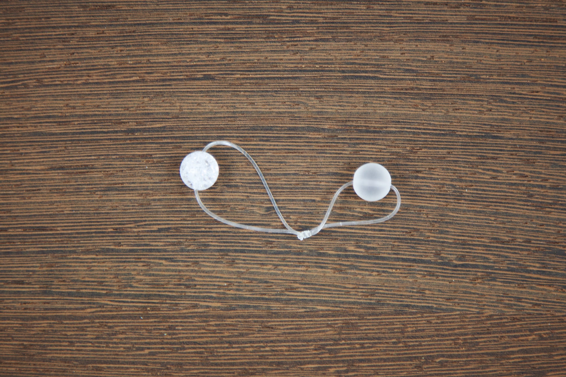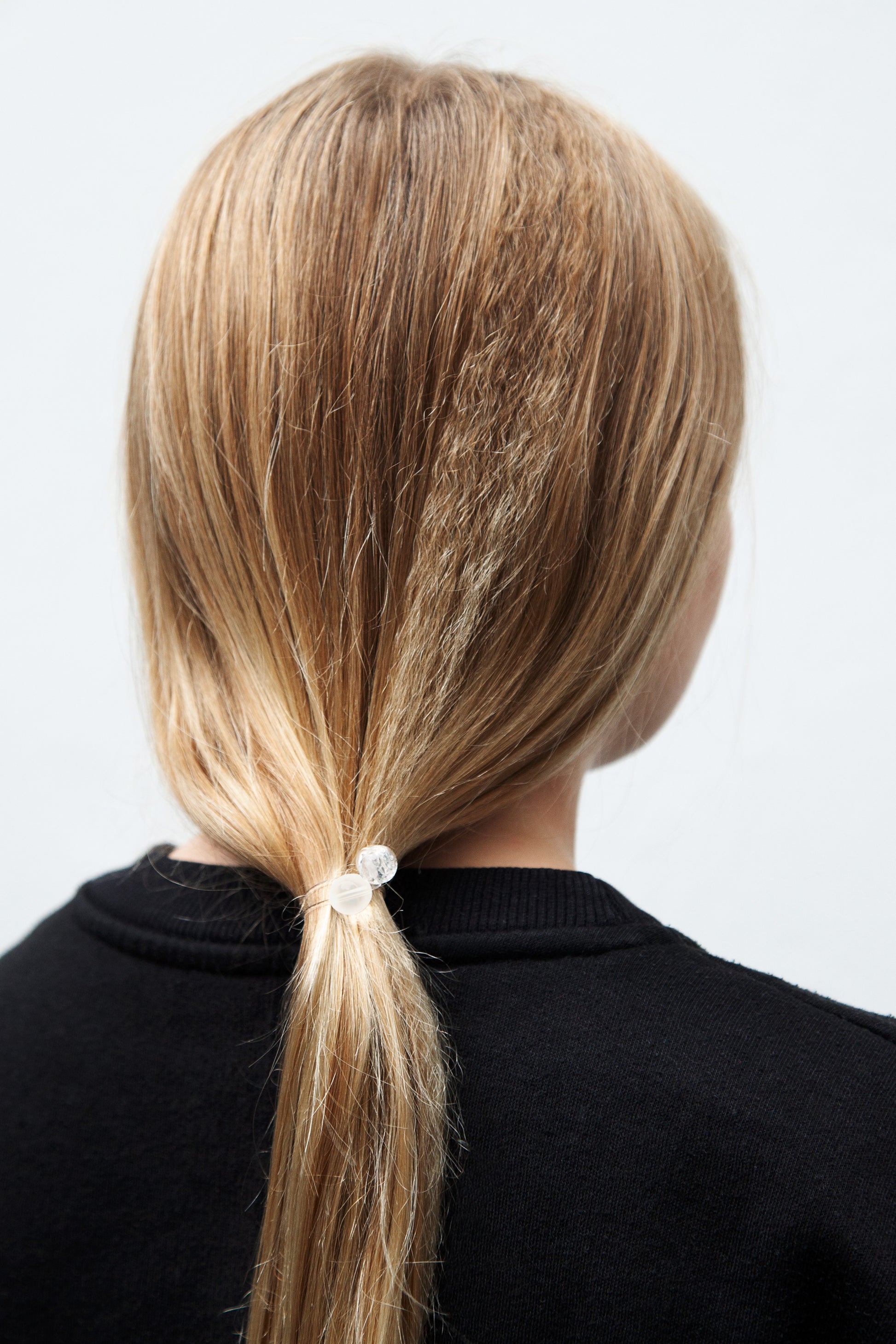 CLINQ's floating hair tie Nola is the little sister of Luna. This unusual, handcrafted hair tie features a frosted Rock Crystal and an Iris Rock Crystal gemstone. The elegant, spherical stones appear to float effortlessly on the hair thanks to the sleek, transparent jewelry elastic, combining style with sophistication. This is NOLA