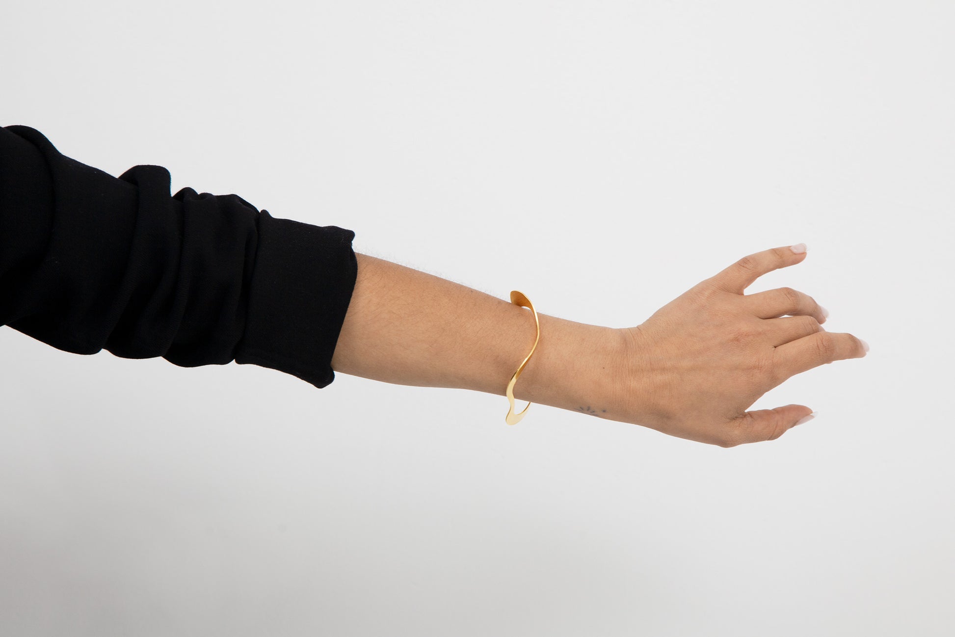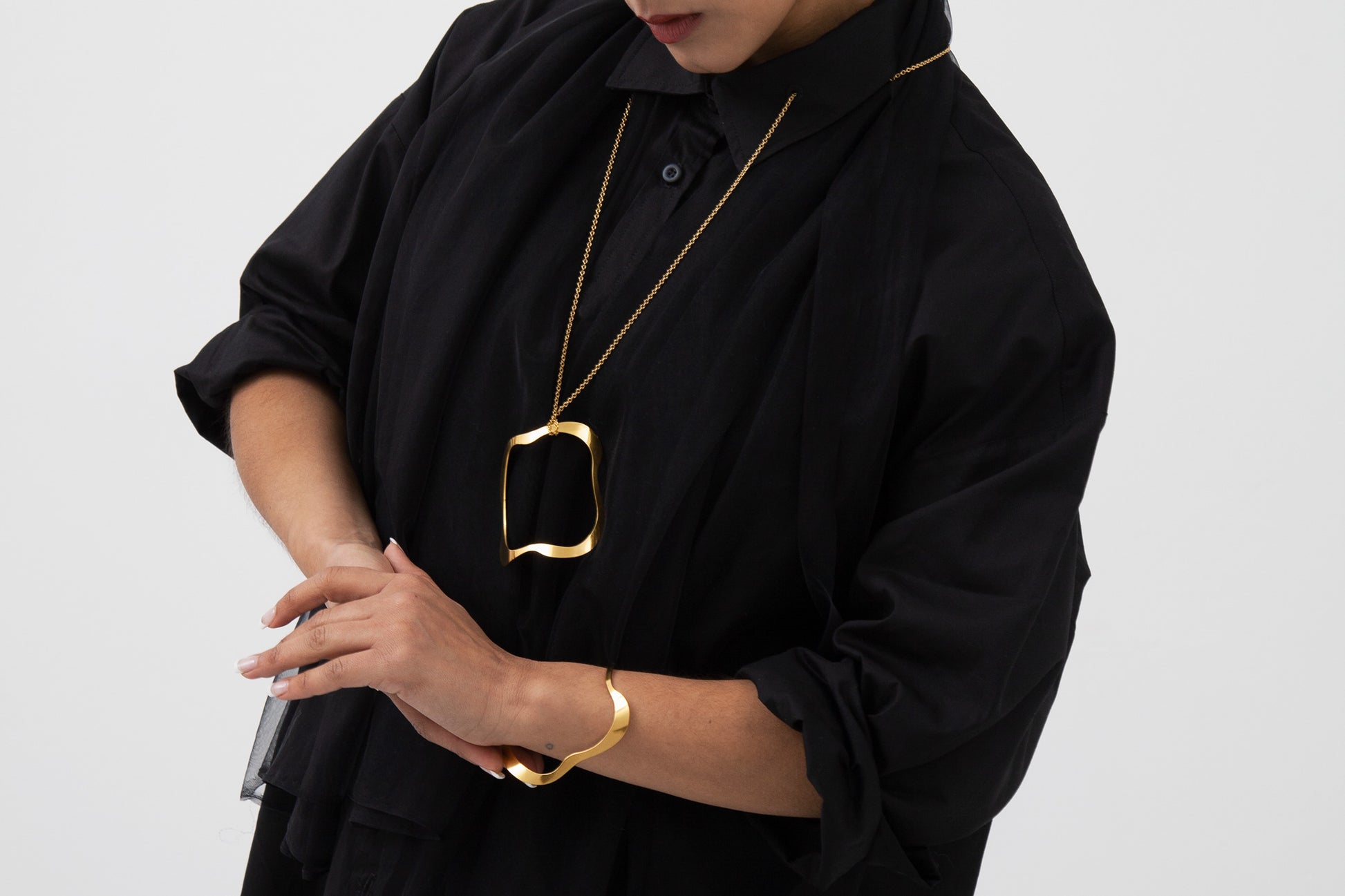 The AYA Slip-On Bangle Bracelet features curved lines that give it its distinctive, organic shape. Handcrafted from high-quality stainless steel, it gracefully wraps around the arm and can easily be transformed into a pendant for a necklace, allowing for added versatility.